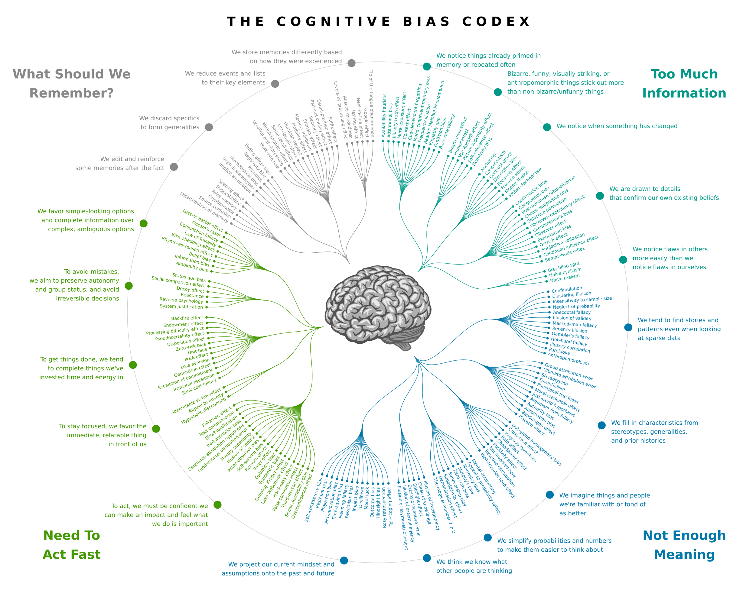 The Cognitive Bias Codex maps more than 180 of these shortcuts into a humbling graphic. They cluster around four survival problems: filtering overwhelming information, making meaning from too little data, acting quickly, and remembering what matters. These habits helped us as hunter-gatherers, but today they can sabotage decision-making.
